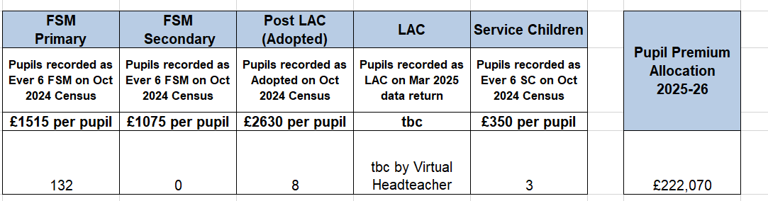 The funding is to be used to address inequalities in educational results. As of September 2025, the level of current pupil premium support funding is as follows:
